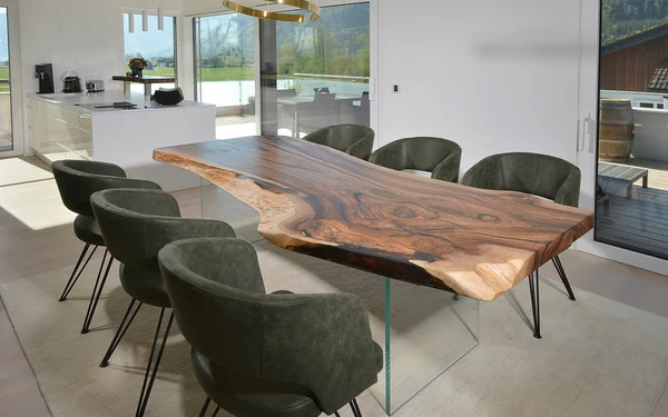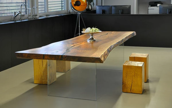 Um dieses „Credo“ umzusetzen, kombinieren wir unsere massiven Holzplatten mit einer eleganten Tischunterkonstruktion aus stabilem Glas – welche unsere Tische auf eine ganze besondere Art & Weise „schweben“ lässt und dadurch den natürlichen Rohstoff Holz in den absoluten Fokus rückt.