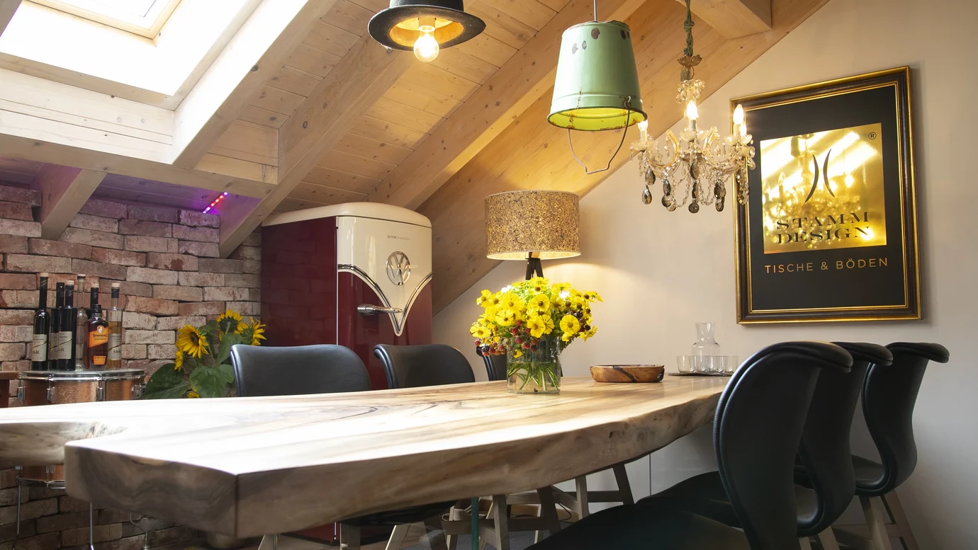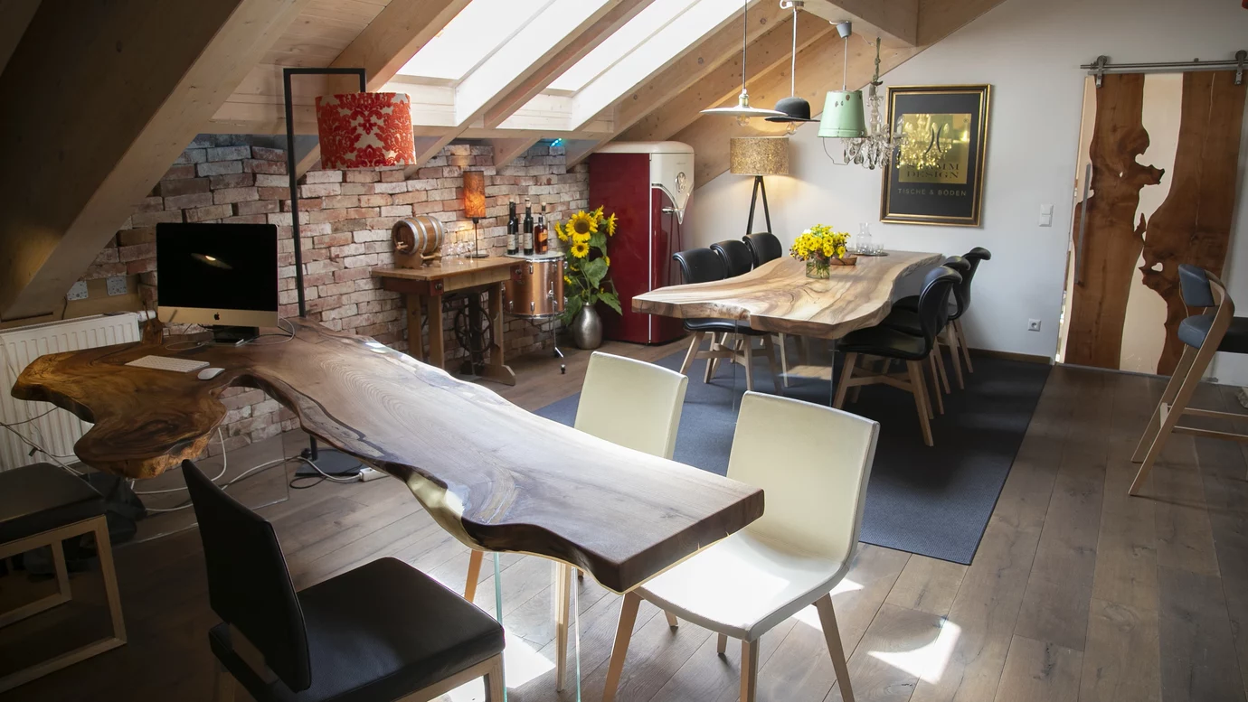 Notre vaste showroom de 180 m2 situé dans notre manufacture de Perwang présente nos produits dans les aménagements intérieurs les plus divers. De la salle de bain à la cuisine, en passant par le séjour et le bureau, nous avons exposé différentes tables. En guise de produit vedette, vous trouverez notre cuisine réalisée dans un arbre, exposée comme pièce maîtresse de la salle de manifestation « Petit espace de plaisir », où nous organisons divers évènements. Le showroom dans son ensemble invite tout simplement à s'attarder. Passez et laissez-vous convaincre.